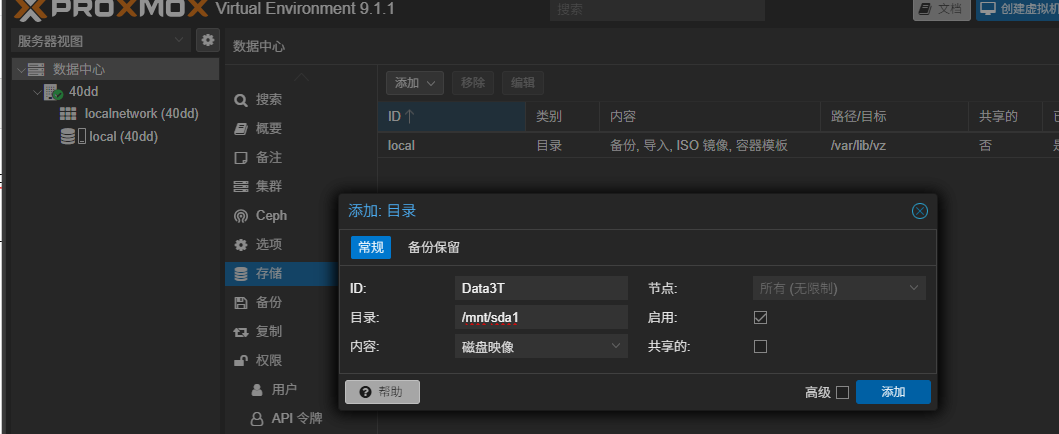 重新添加存储:Web UI→数据中心→存储→添加→选择对应存储类型(LVM/ZFS/ 目录),指向挂载点